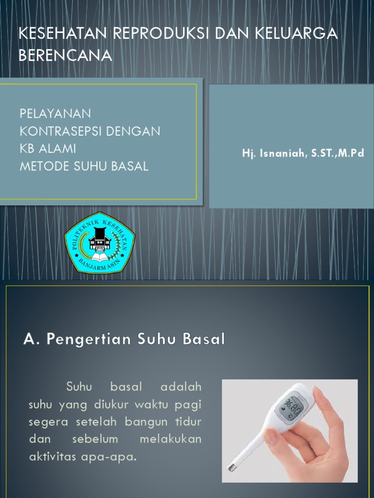 Suhu tubuh bisa dipengaruhi oleh berbagai hal, misalnya suhu lingkungan. Suhu tubuh basal adalah suhu terendah yang dicapai oleh tubuh selama istirahat atau dalam keadaan istirahat (tidur). Laju metabolisme basal (basal metabolisme rate, bmr) di semua sel tubuh. Suhu basal tubuh diukur dengan alat yang berupa termometer basal. Perubahan pada suhu basal tubuh juga bisa menjadi tanda atau ciri yang bisa anda perhatikan ketika memasuki masa subur. Perubahan suhu ini seharusnya melebihi suhu tertinggi yang tercatat dalam enam hari sebelumnya. Perubahan suhu pada kala i suhu basal tubuh anda adalah temperatur yang diambil secara oral pada saat anda pertama kali bangun di pagi hari. Pada ken#ataann#a, suhu basal tubuh akan tetap tinggi selama masa kehamilan anda. Metode suhu tubuh dilakukan dengan wanita mengukur suhu tubuhnya setiap hari untuk mengetahui suhu tubuh basalnya. Biasanya ada perbedaan kecil antara fase suhu rendah dan fase suhu tinggi: Basal body temperature atau suhu tubuh basal adalah suhu tubuh pertama seseorang di pagi hari dan pada wanita dapat menunjukkan pergeseran hormon dalam tubuh selama siklus menstruasi. Dari perubahan suhu basal tubuh tersebut, kita dapat memprediksi masa ovulasi dan menstruasi kita, kemudian kita dapat mengontrol kelahiran. Suhu basal sebagai kontrasepsi metode suhu tubuh dilakuakn dengan wanita mengukur suhu tubuhnya setiap hari untuk mengetahui suhu tubuh basalnya.
